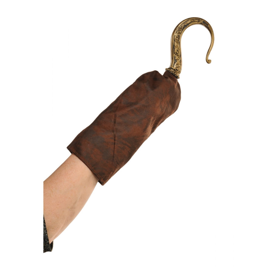 Pour peaufiner votre déguisement de corsaire, nous vous présentons le crochet de pirate doré fixé sur un manche marron pour adulte.