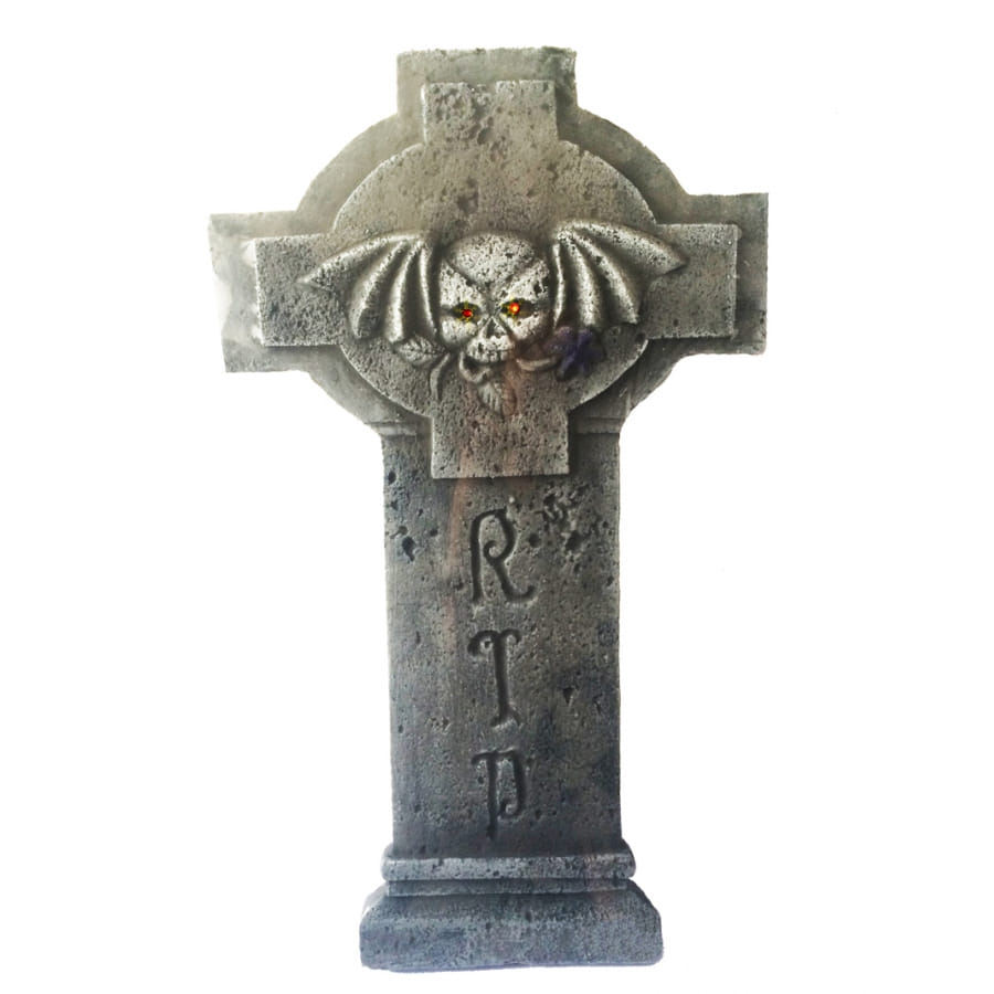 Une décoration véritablement horrifiante ! Cette Croix de tombe RIP à 95% en polystyrène et 5% en plastique. La mention RIP et une tête de mort possédant des yeux lumineux sont représentées sur son devant. La lumière est changeante, fonctionnant avec 3 piles LR44 incluses. La pierre tombale est de couleur grise, dotée d'un réalisme surprenant, mesurant 60 cm de hauteur. Posée dans le jardin ou contre un mur, elle fera fuir tout votre entourage le soir d'Halloween. Effet bluffant assuré !