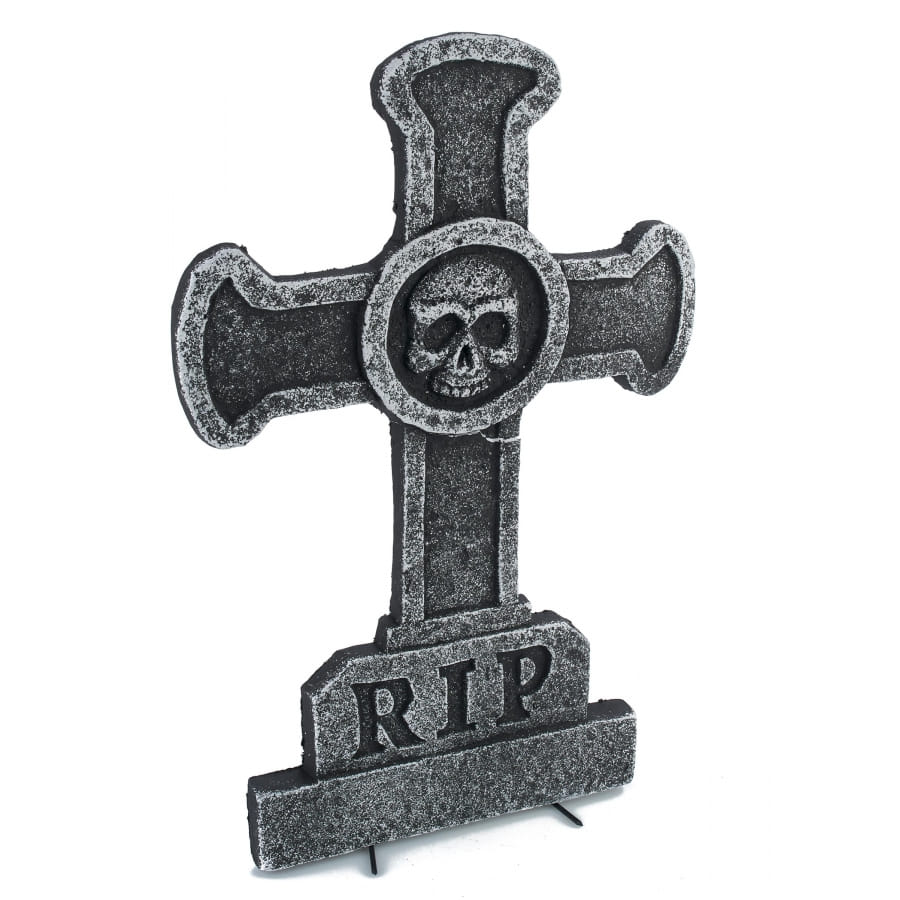 La croix rip avec crâne de 58 cm est la représentation d'une pierre tombale en polystyrène.