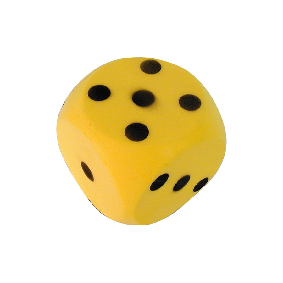Balle en forme de gros dé en mousse de couleur jaune et noire. Cet accessoire mesure 15 centimètres. Ajoutez cette balle parmi les jouets d'anniversaire de vos enfants.