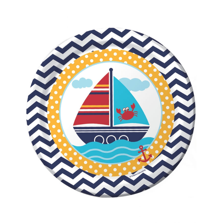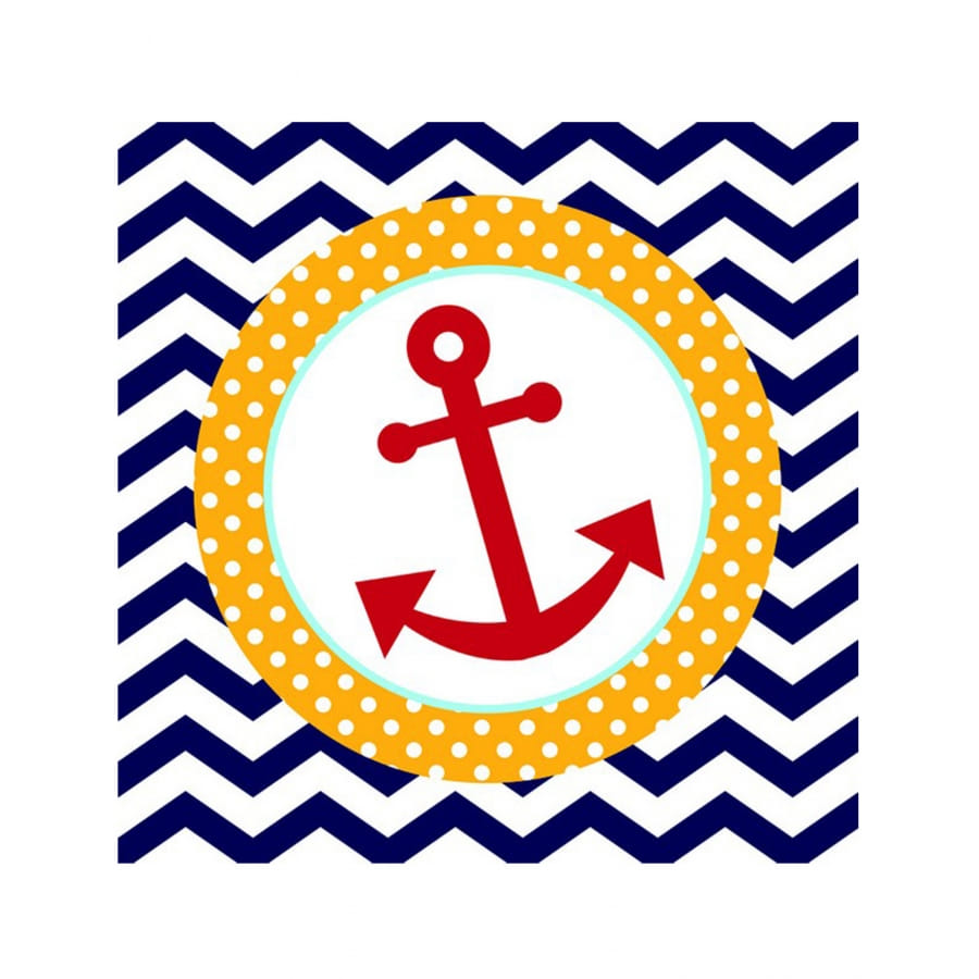 Elles sont imprimées de chevrons bleu et blanc sur la bordure, d'un hublot jaune à pois blanc et au centre une ancre rouge.