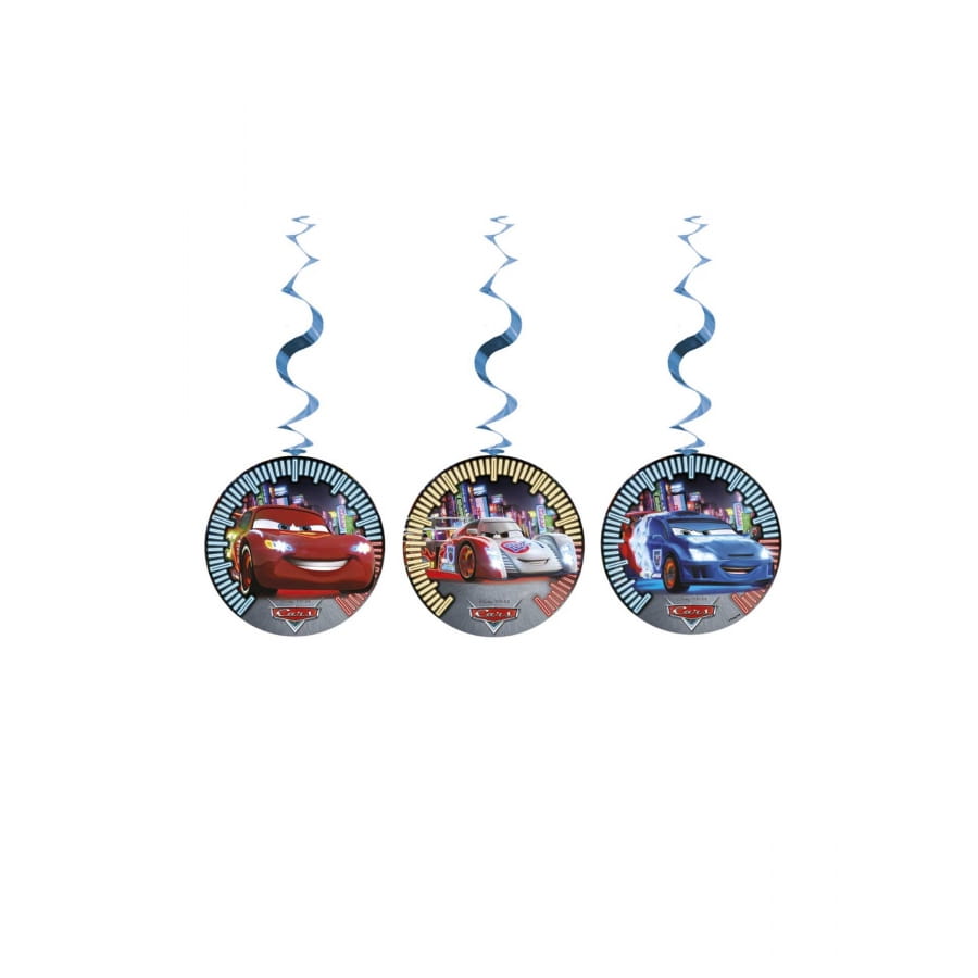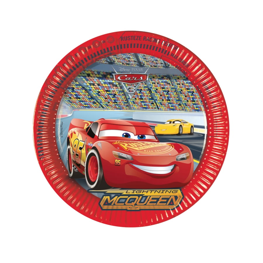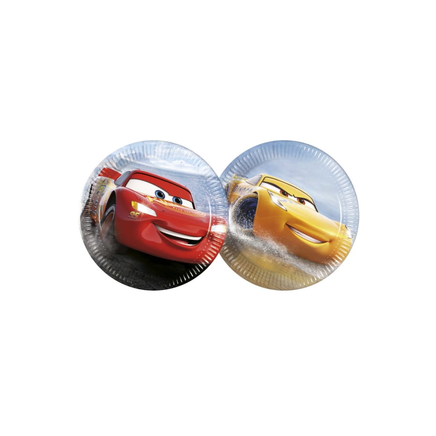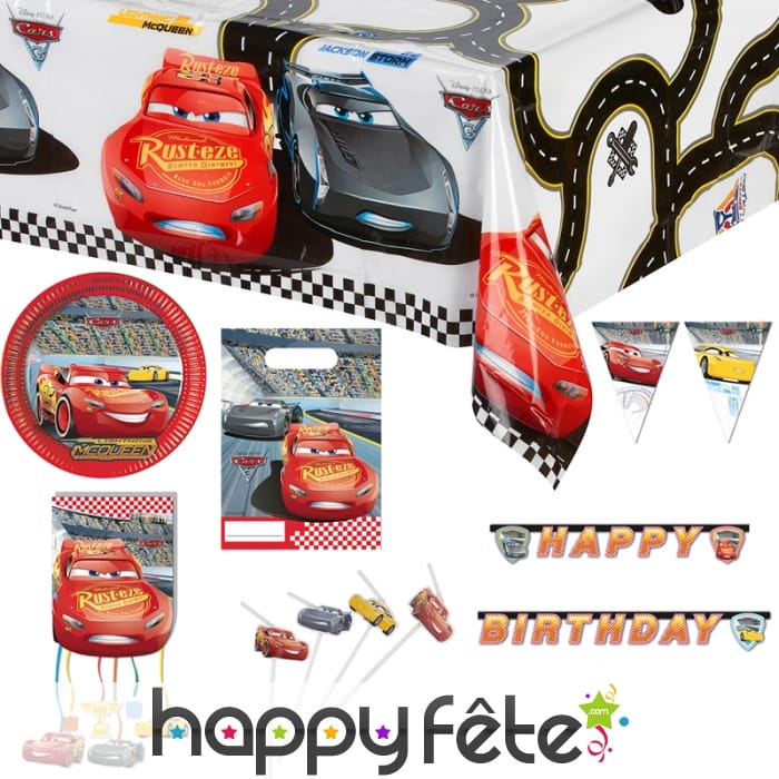 • Accessoires décoratifs sur le thème Cars 3 comprenant au choix: 8 gobelets McQueen, 8 assiettes de 23 cm, 1 guirlande à fanions, 1 pinata, 1 nappe de 120 x 180 cm, 1 guirlande articulée, 4 pailles, 1 centre de table, 13 bougies, 6 sacs cadeaux, 6 pailles, 20 serviettes, 8 assiettes de 23 cm, 8 gobelets, 6 chapeaux, 6 pailles, 8 assiettes de 20 cm, 3 suspensions en spirale, 1 présentoir à cupcakes, 1 déco de porte, 4 invitations, 8 assiettes de 20 cm.
