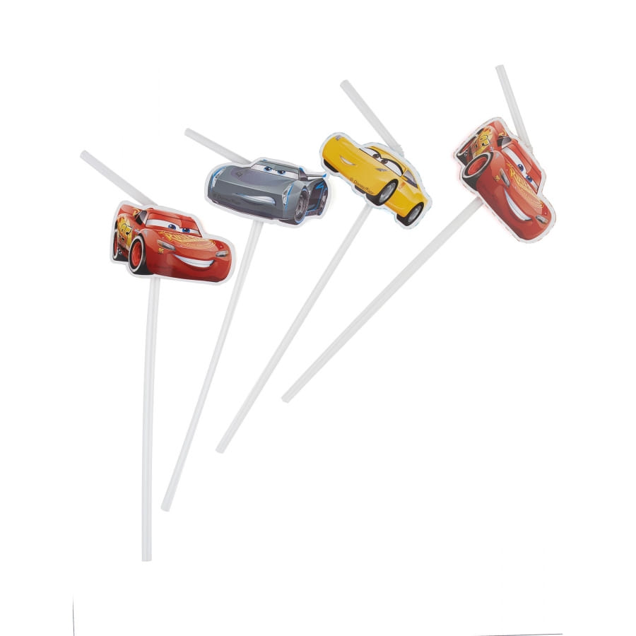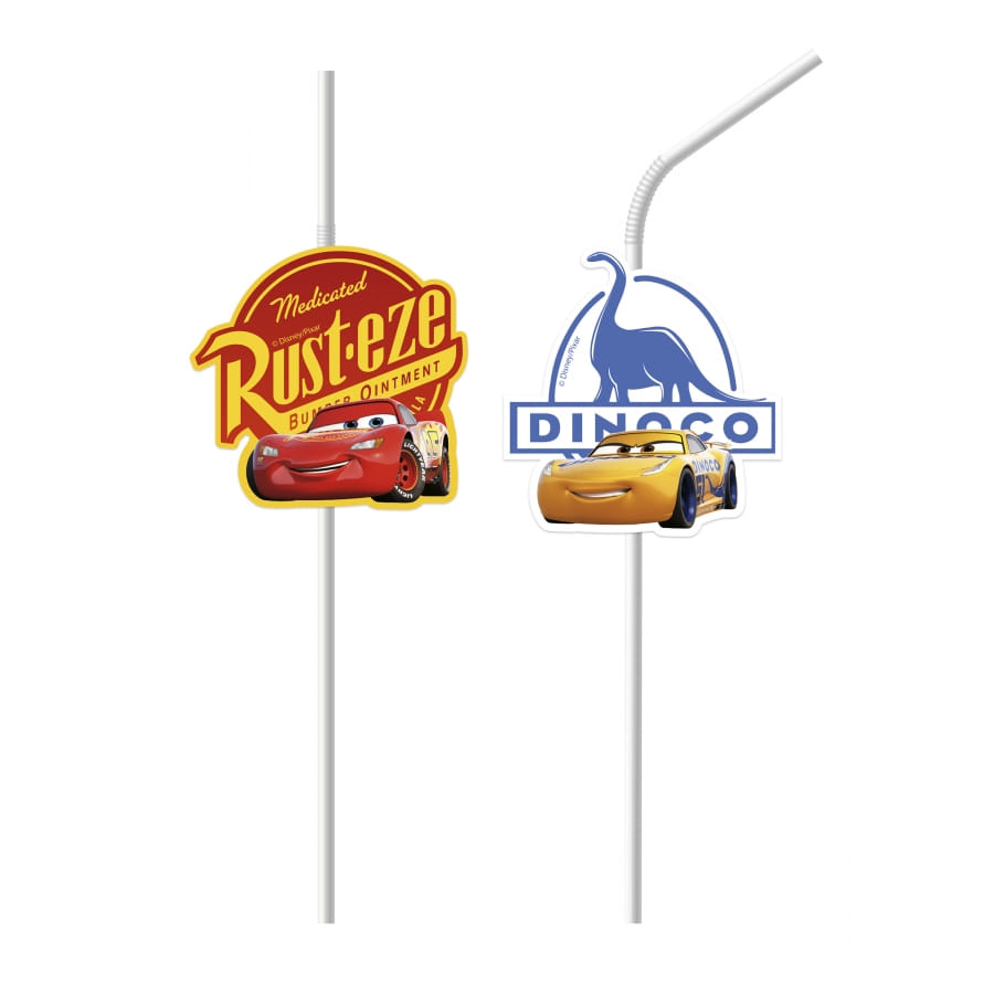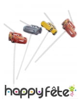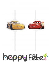 - 6 pailles surmontées de vignettes cartonnées en forme de voitures de course.