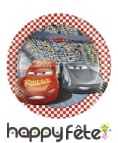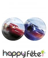 - 8 assiettes en carton de 23 cm de diamètre imprimées de voitures de course sur une piste.