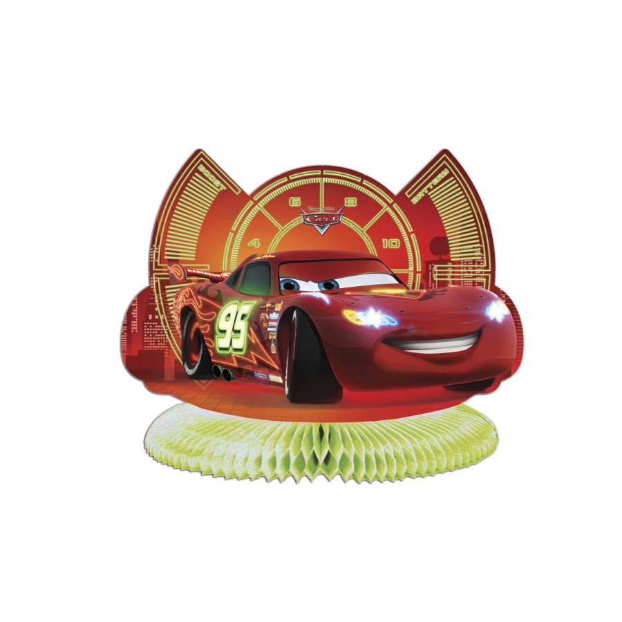 - 1 centre de table fait de papier alvéolé à la base et surmonté par de la voiture de course McQueen.