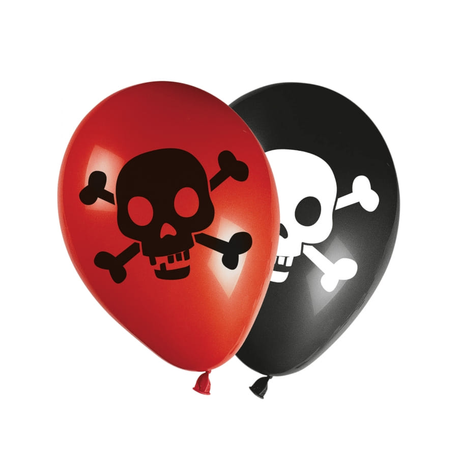 - 1 lot de 8 ballons en latex imprimés tête de mort noir pour les 4 rouges et tête de mort blanche pour les 4 autres noirs.