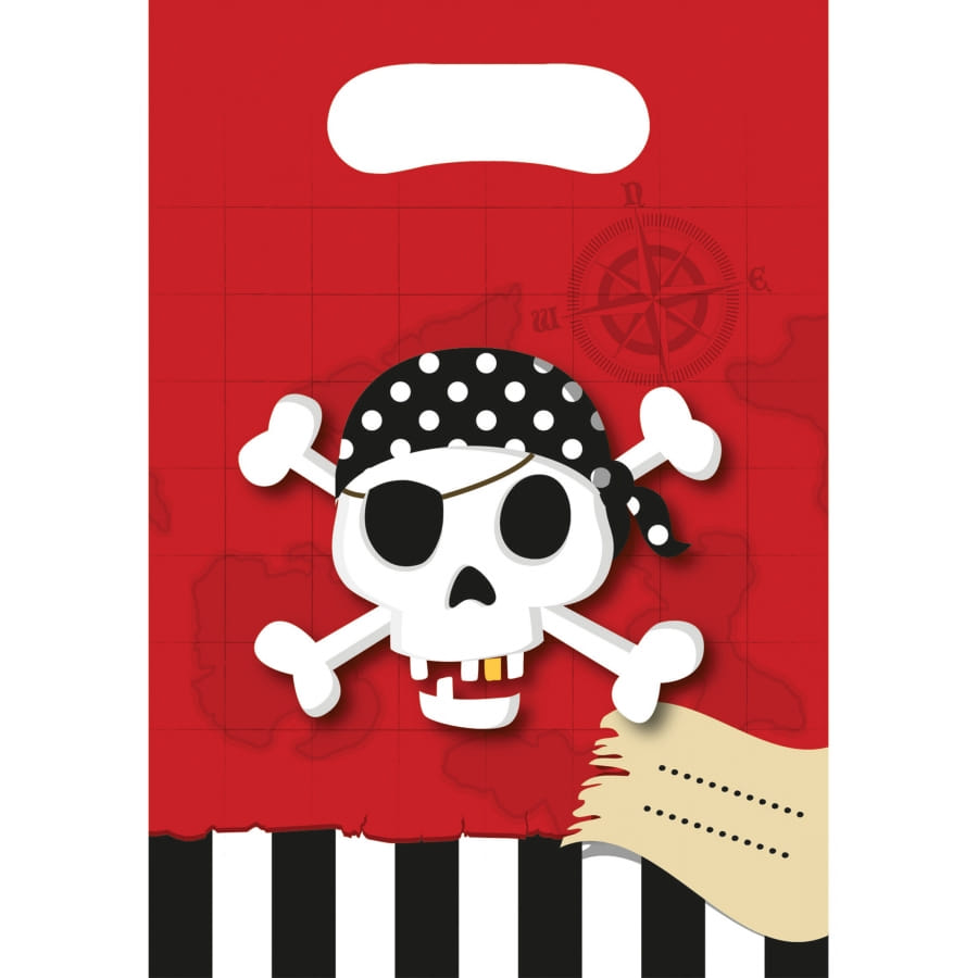 - 6 sacs cadeaux en plastique de 23,5 x 16 5 cm imprimés tête de mort de pirate sur un fond rouge représentant une carte au trésor avec des rayures noir et blanc sur le bord et un petit espace marron réservé pour inscrire le nom.