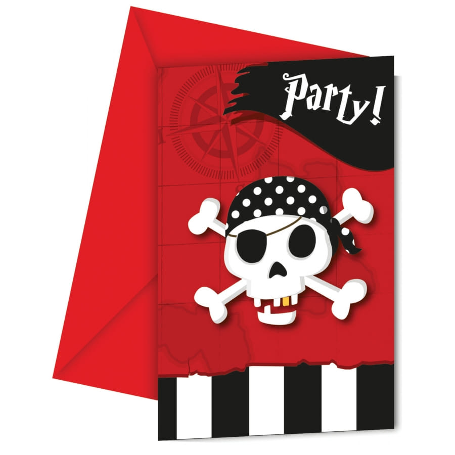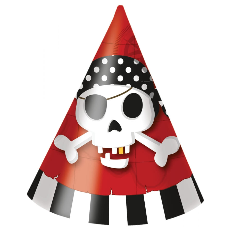 - 6 chapeaux d'anniversaire en carton également floqués d'une grosse tête de mort pirate.