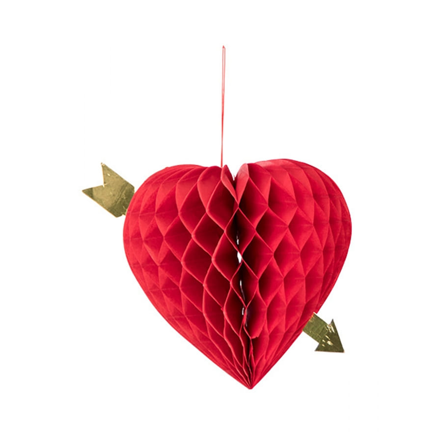 La déco coeur en papier alvéolé rouge de 20 cm est à suspendre.