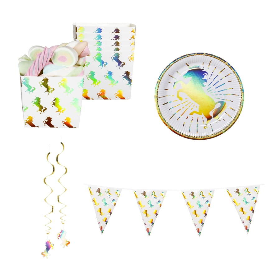 Féerique et magique, cette Déco de licorne scintillante colorée pour table sera parfaite pour un anniversaire haut en couleur.