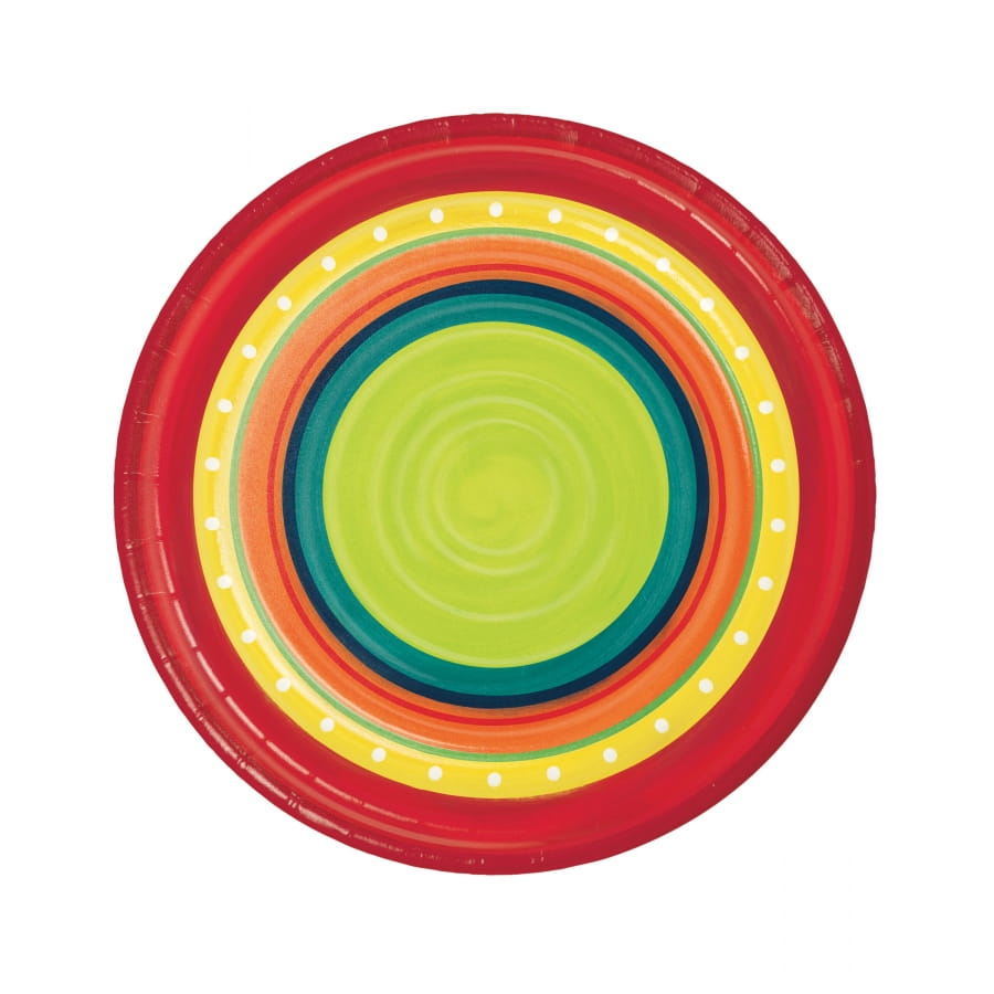 - 8 assiettes rondes en carton mesurant environ 22 cm de diamètre. La bordure est vert avec des traits blancs tandis que le centre est orné de plusieurs cercles colorés.