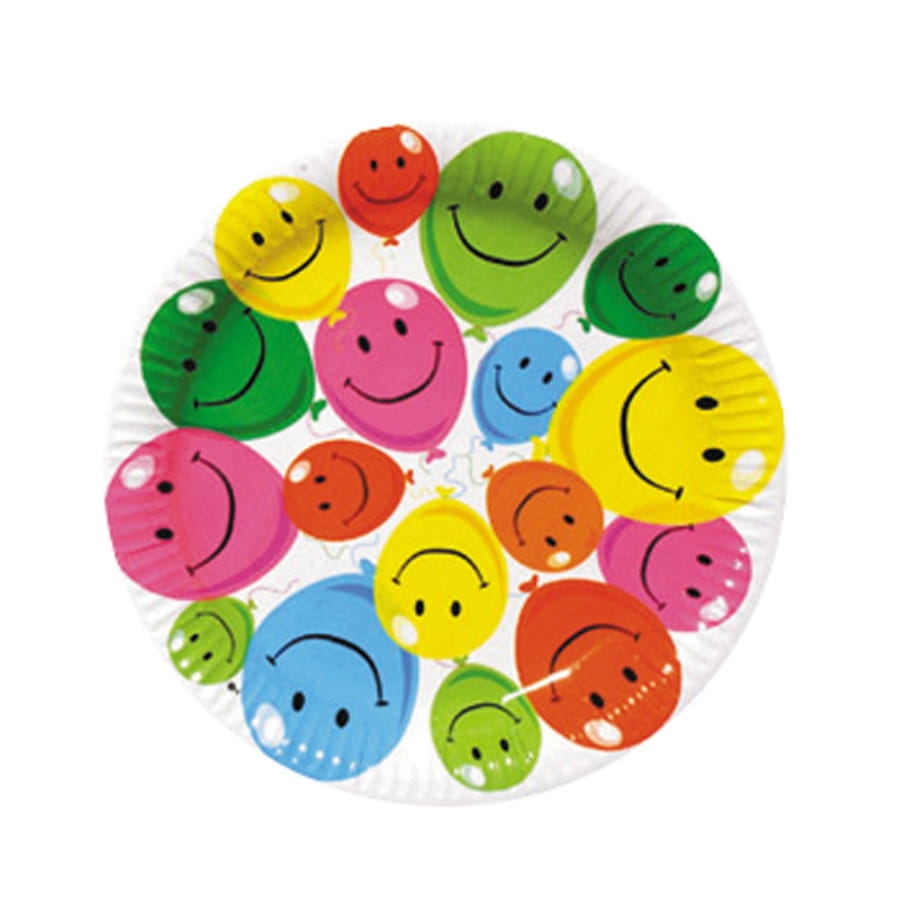 6 assiettes en carton de 22 cm de diamètre couleur blanche ornementées de nombreux ballons multicolores souriant.