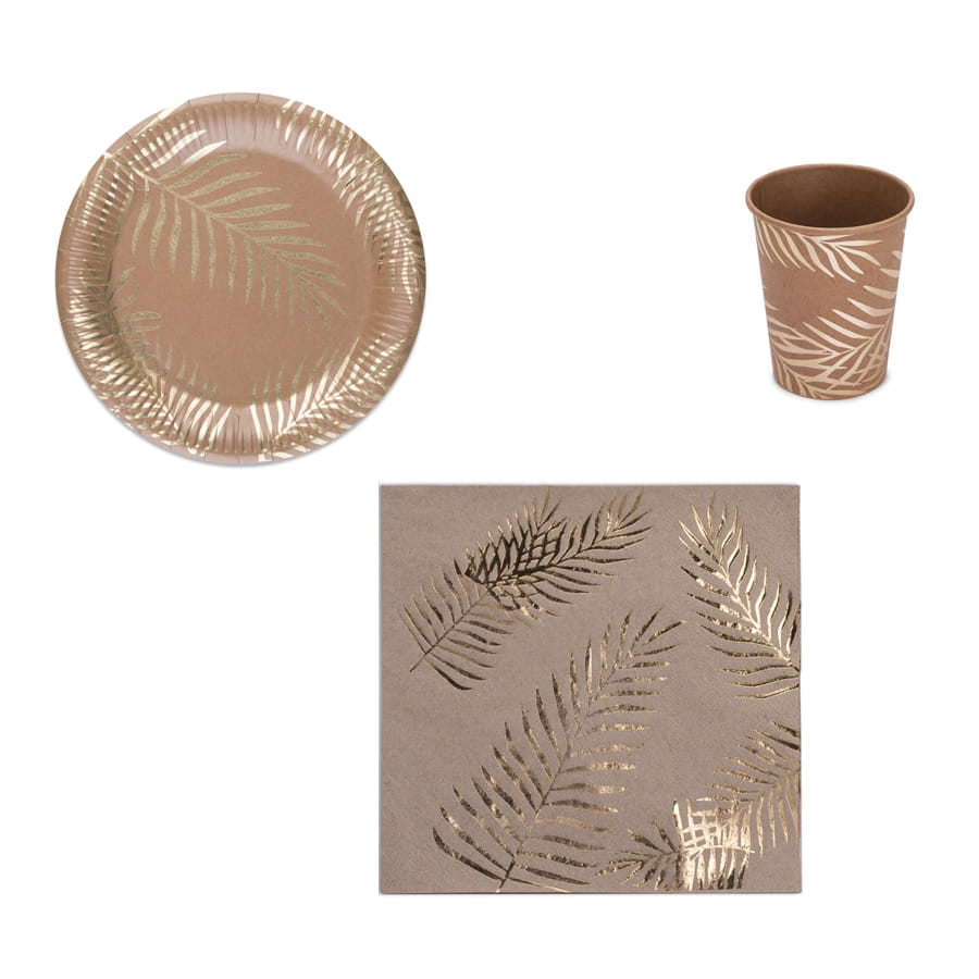 Chacun de ces produits est en kraft (couleur beige) et est orné de feuilles tropicales dorées.