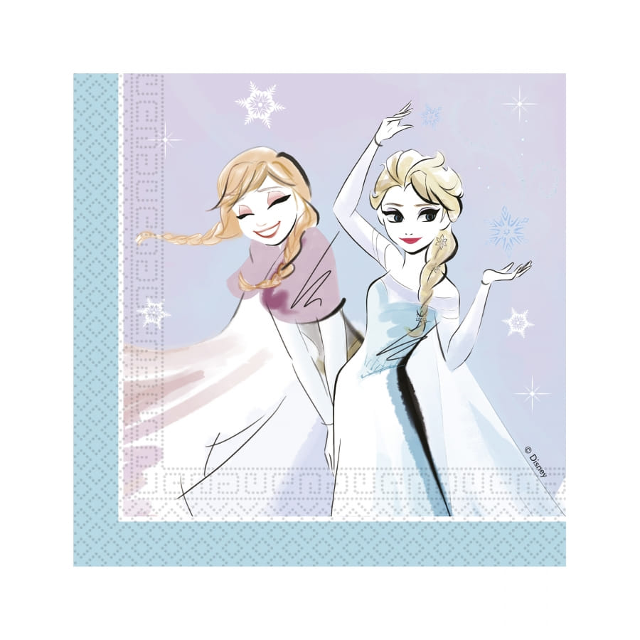 Celle-ci est imprimée des personnages Anna et Elsa sur un fond violet illuminé de flocons blancs.