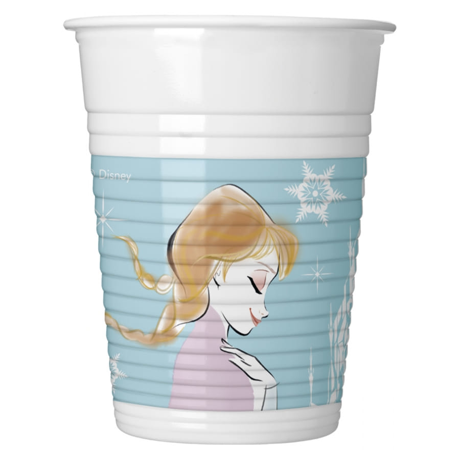 6 gobelets portant l'image d'une des princesses du royaume d'Arendelle sur fond bleu pastel et entourée de flocons de neiges blancs.