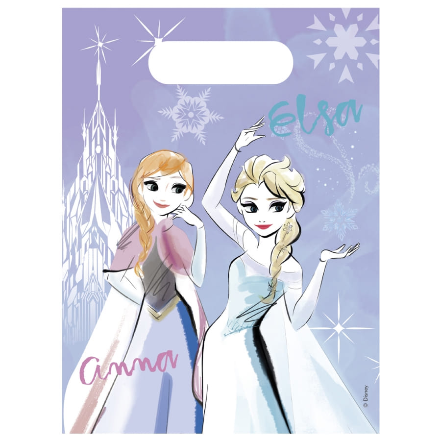 6 sacs cadeaux à l'effigie des princesses Anna et Elsa, avec un arrière plan violet et l'image du château d'Arendelle.
