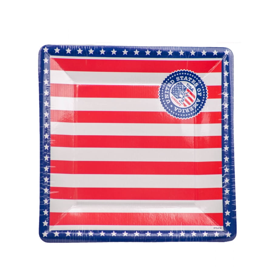 Vous avez au choix : 8 assiettes en carton aux couleurs des couleurs et des bandes du drapeau américain avec en haut l'inscription UNITED STATES OF AMERICA de 24,5 cm