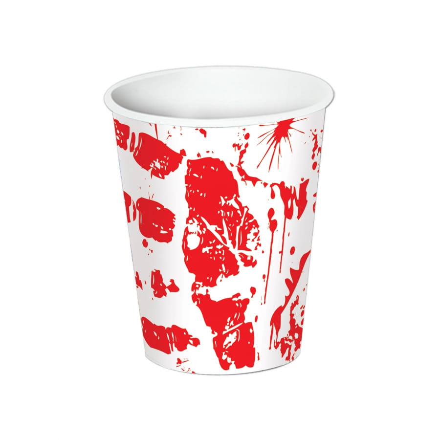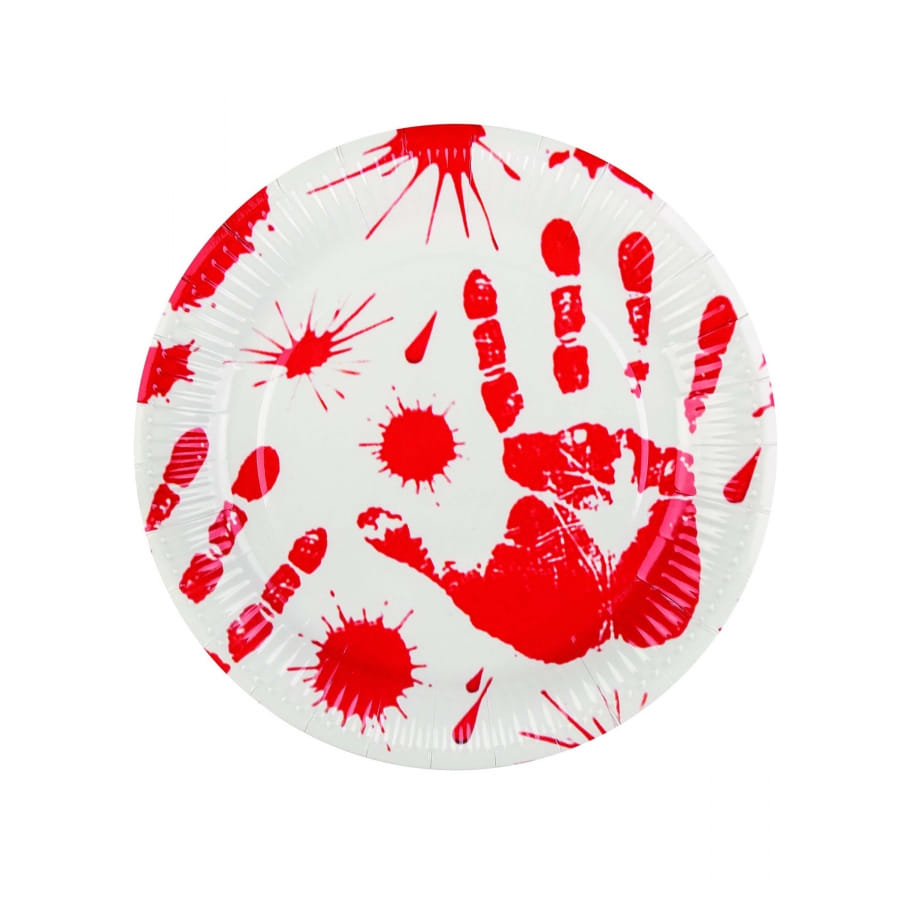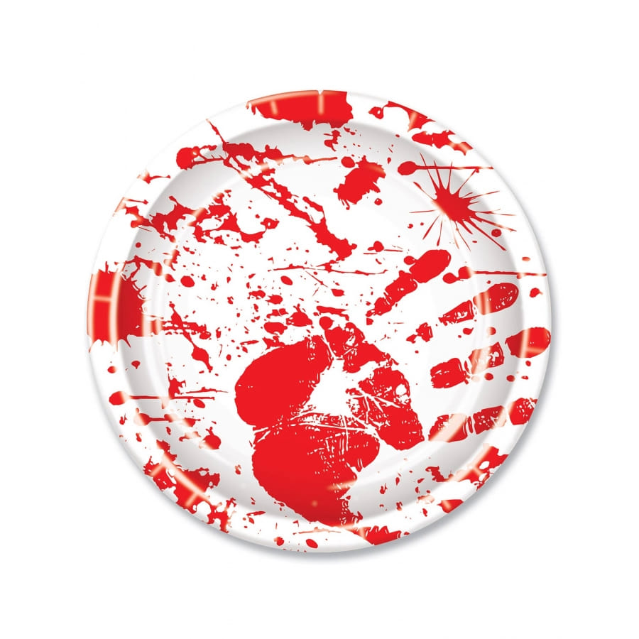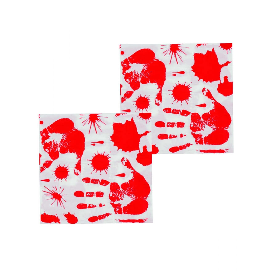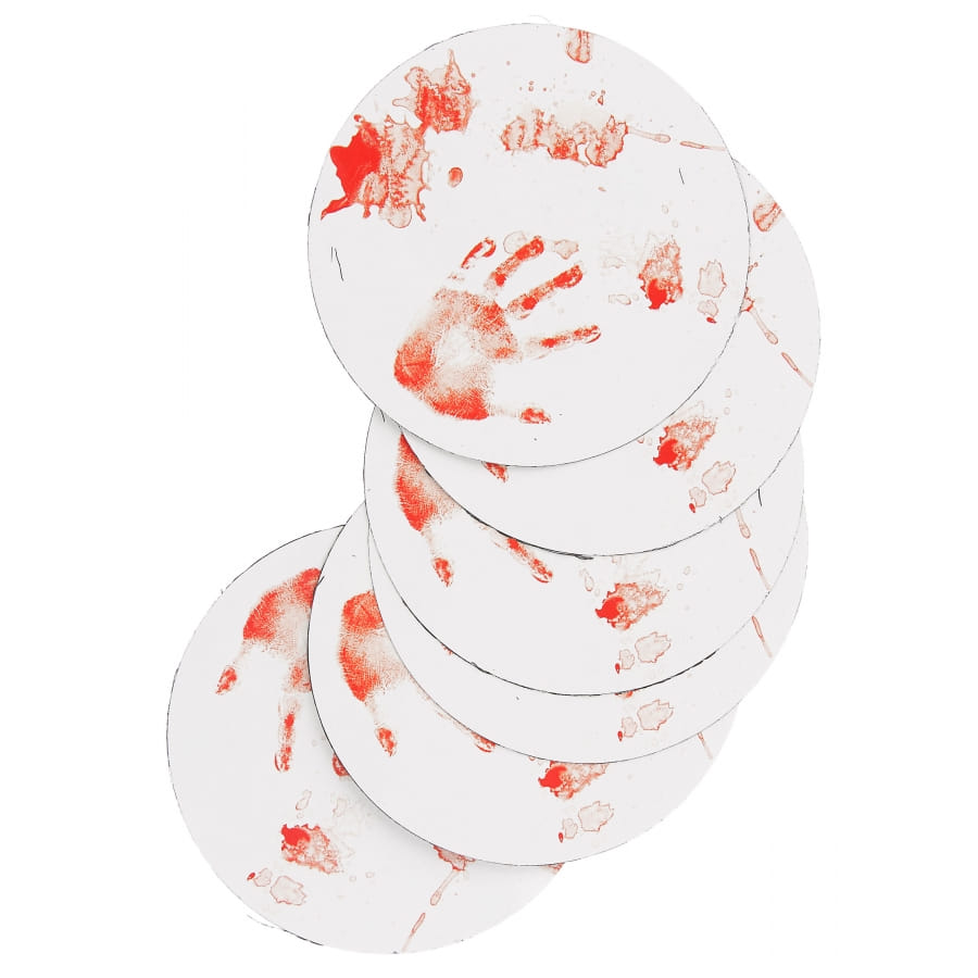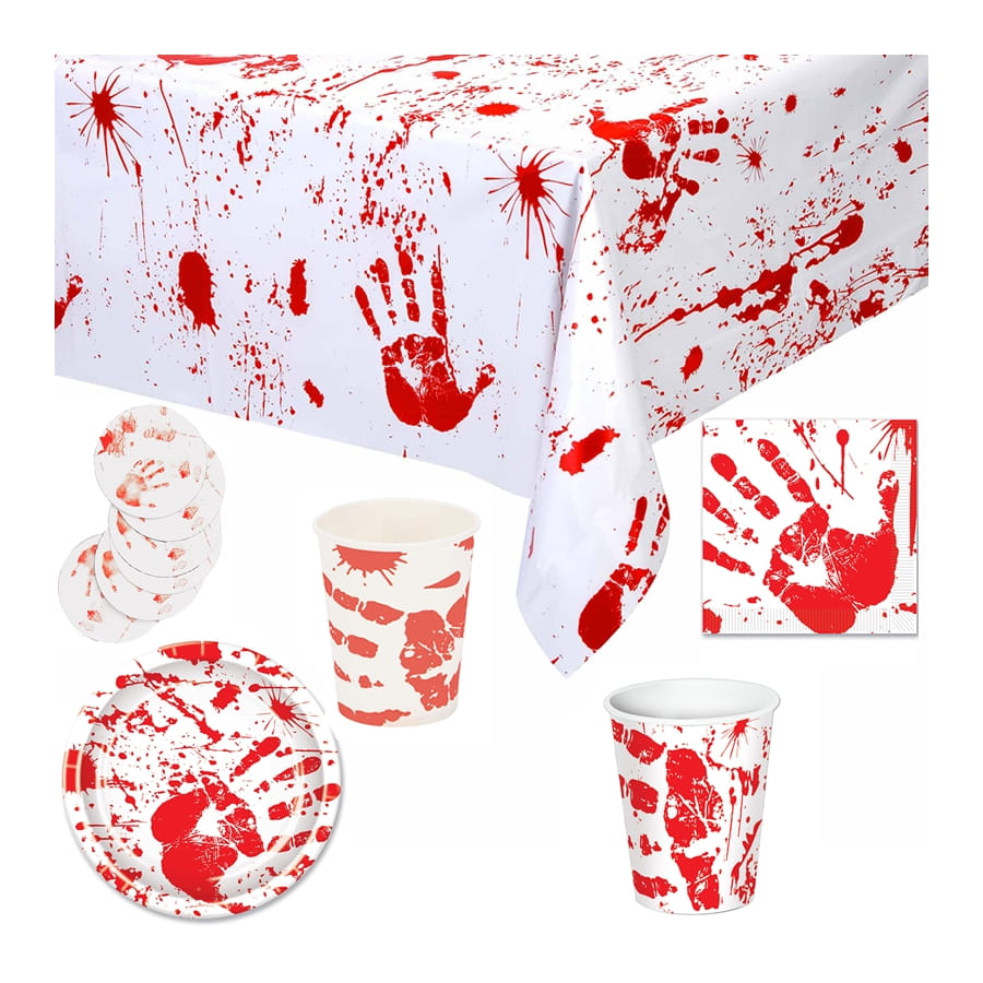Il est question d'un ensemble d'accessoires de couleur blanche, qui présente des imprimés de traces de mains ensanglantées et de tâches de sang.