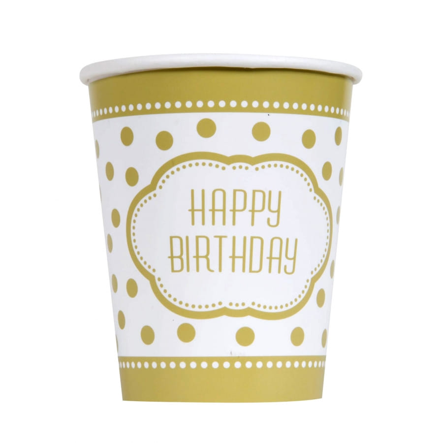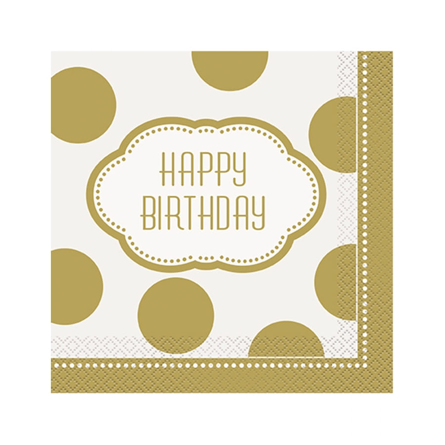 Des ronds dorés sont imprimés sur toute la surface et au centre le message Happy Birthday.