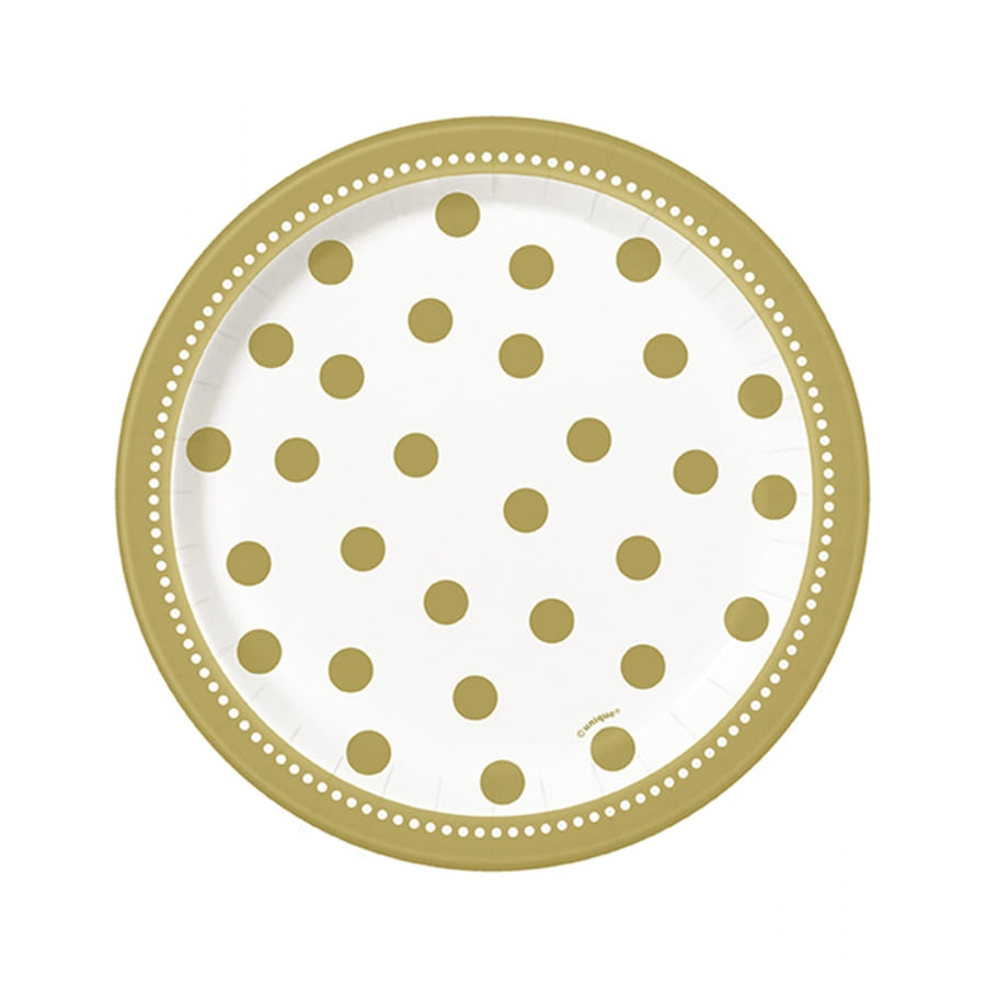La bordure est dorée tandis que le centre est blanc et agrémenté de petits ronds dorés.