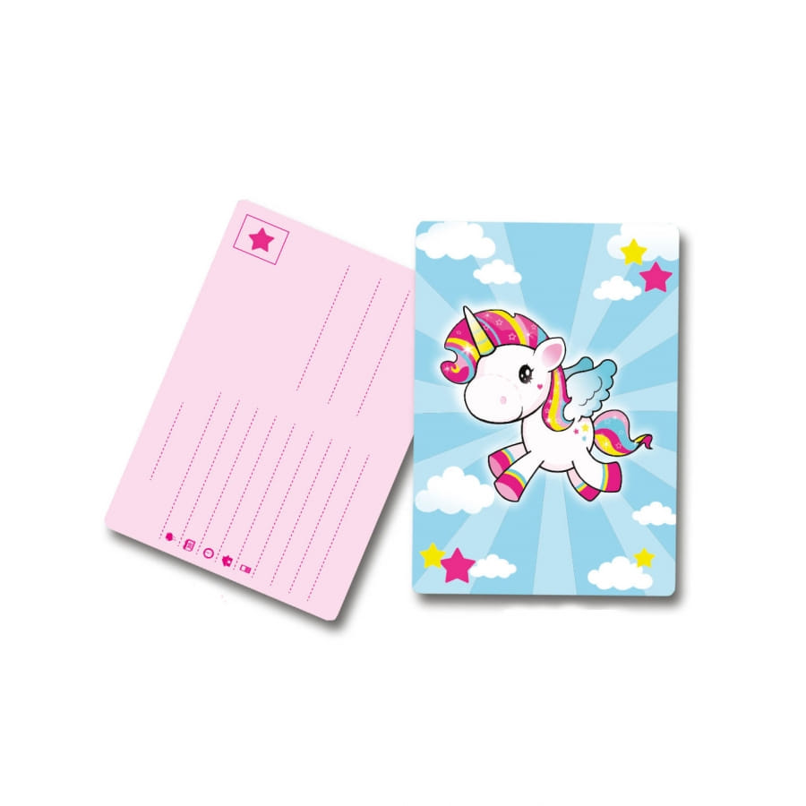 - 8 cartes d'invitations de 14.5 x 10.2 cm de couleur bleue avec une licorne volant dans le ciel nuageux orné d'étoiles.
