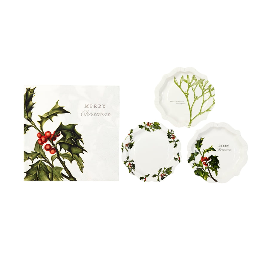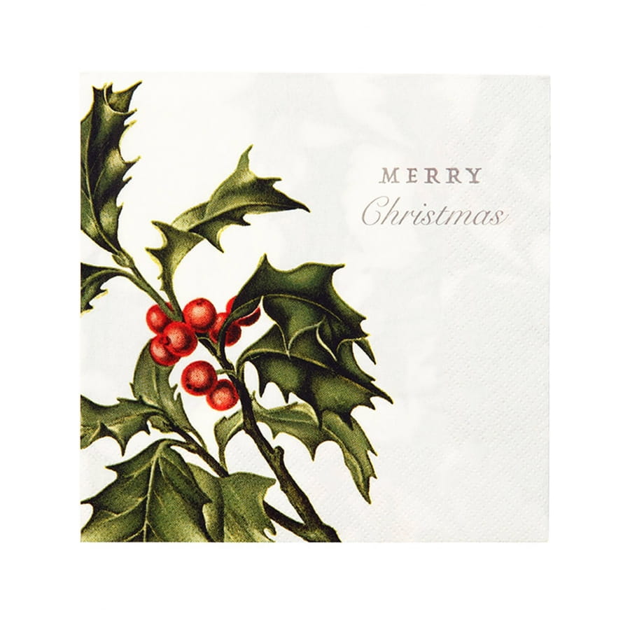 20 serviettes mesurant 12,5 x 12,5 cm lorsqu'elles sont pliées et 33 x 33 cm une fois dépliées, marquées sur fond blanc de l'inscription Merry Christmas près d'une branche de houx.
