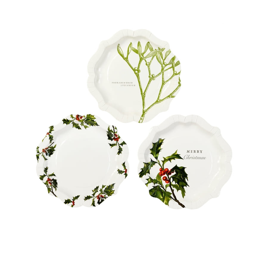 Certaines assiettes présentent une feuille de gui près de l'inscription Phoradendron Leucarpum, d'autres des feuilles de houx éparpillées sur la bordure, et enfin des assiettes portant l'image d'une grande branche de houx et l'inscription Merry Christmas.