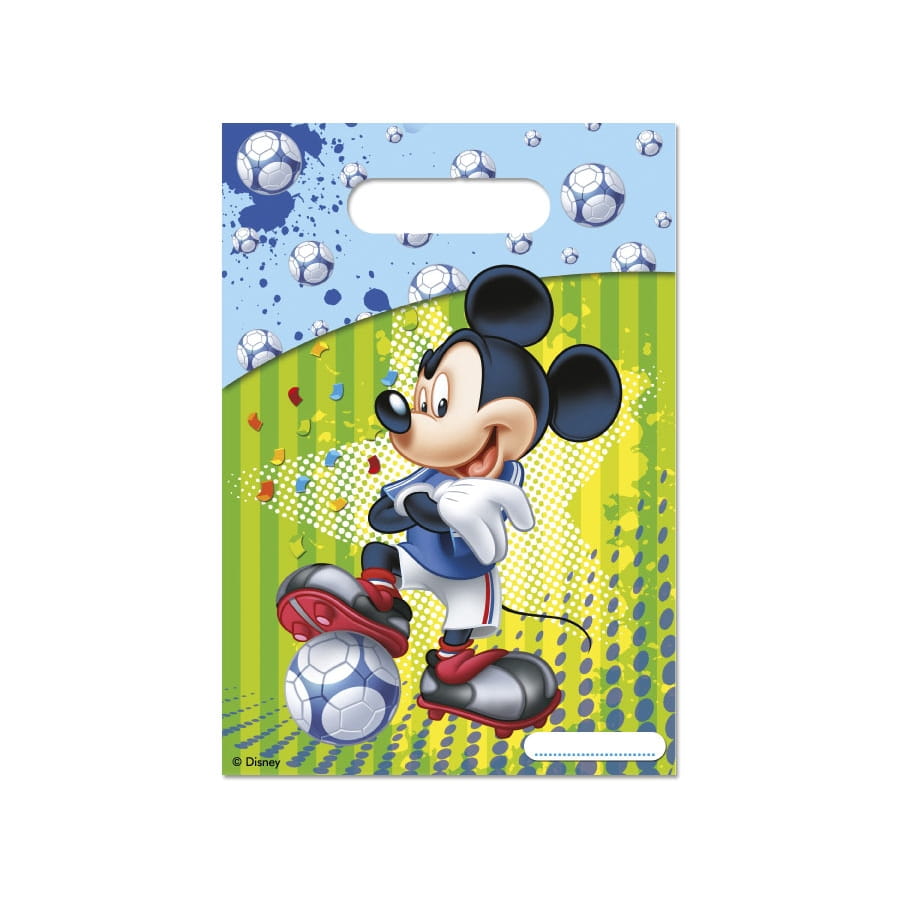 Chaque sac présente un imprimé de Mickey en tenue de foot sur fond vert, avec des ballons sur fond bleu.