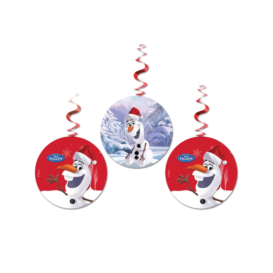 3 suspensions faite d'une ficelle en spirale rouge métallisée avec une vignette ronde à l'effigie du joyeux bonhomme de neige ami de la reine des neiges,