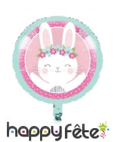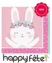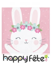 On peut y voir un lapin blanc portant une couronne de fleurs sur la tête et imprimé sur fond rose.