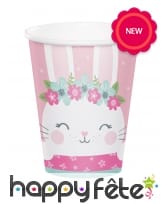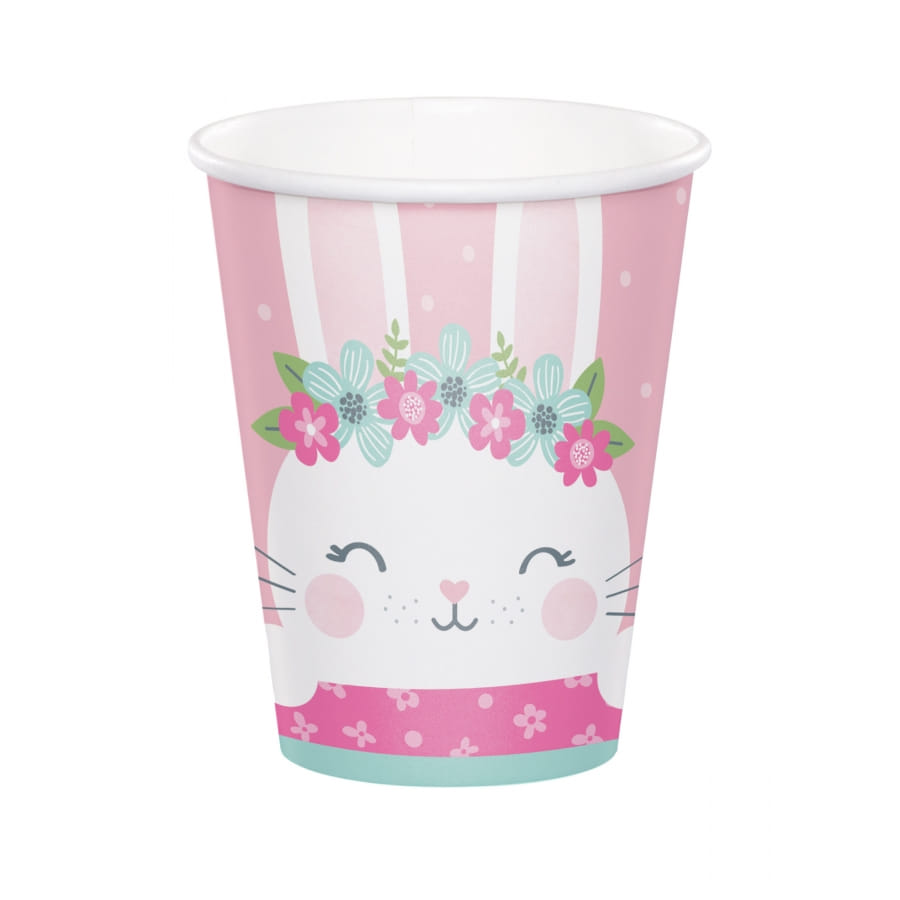 - Gobelets cartonnés effigie lapin blanc sur fond rose.