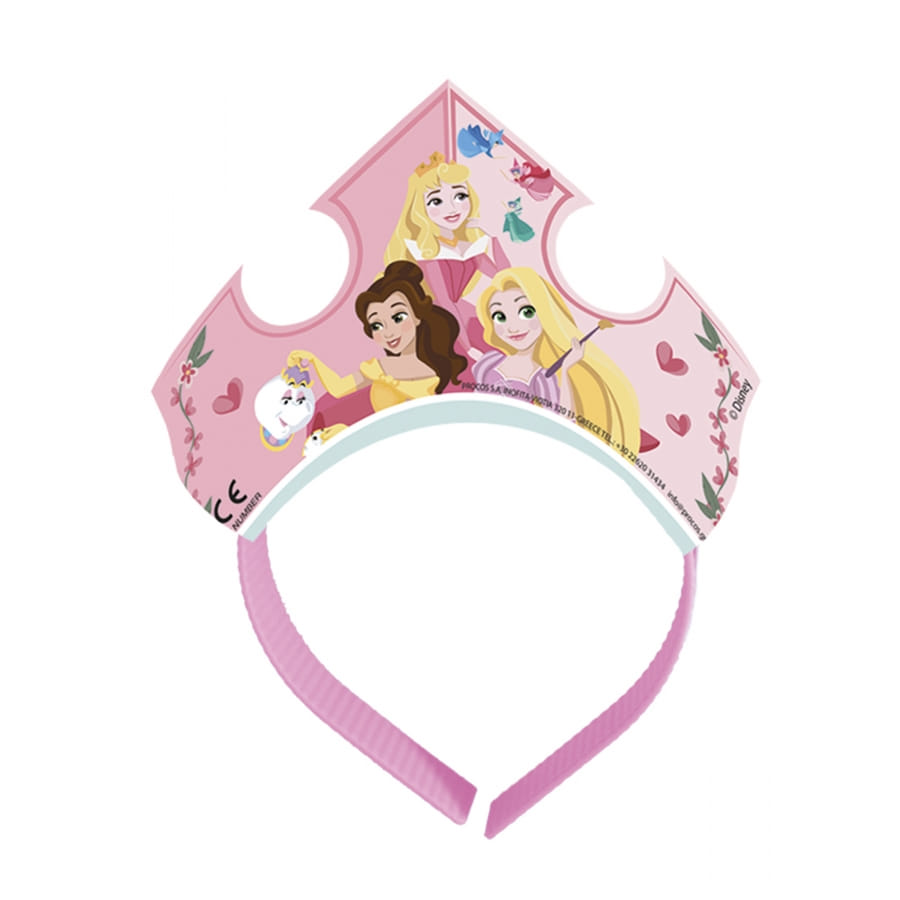 - 4 tiares consistant en un serre-tête surmonté d'une coiffe colorée imprimée des princesses de Disney.