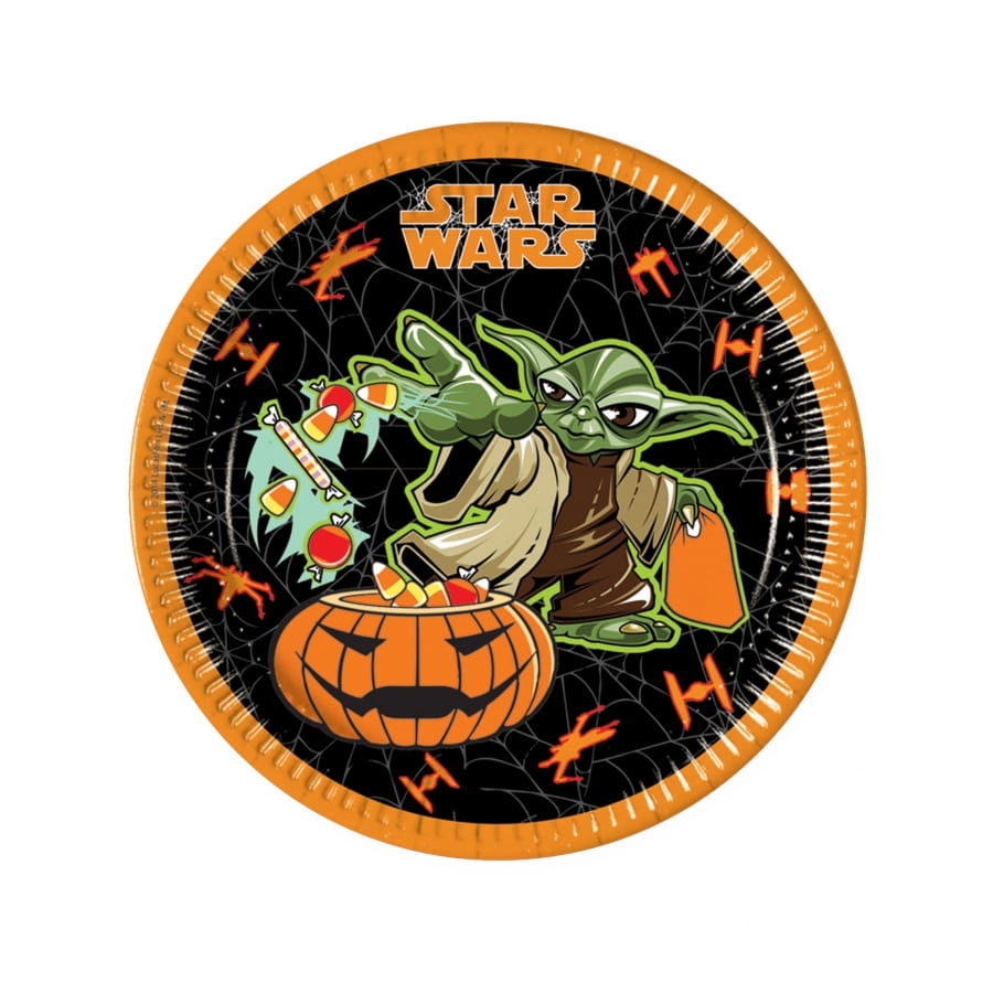 8 assiettes en carton de 23 cm de diamètre. Elles sont noires avec des bordures orange. Au centre, le maître Yoda dépose des bonbons dans une citrouille orange à l'air effrayant.