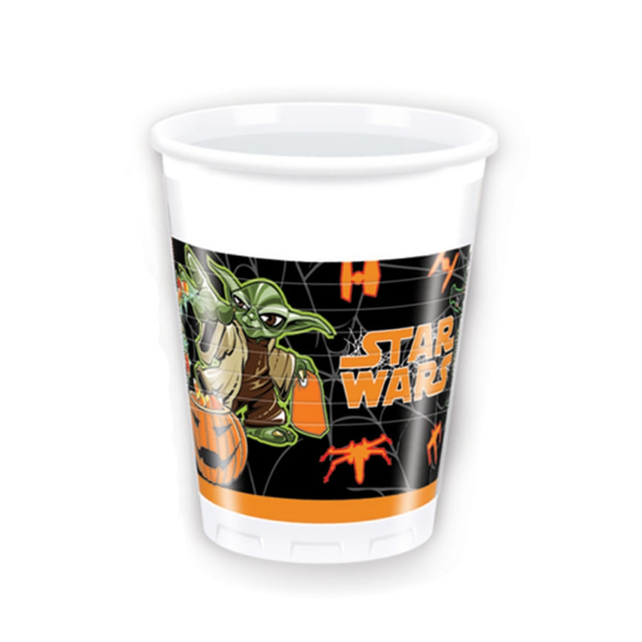 1 pack de 8 gobelets de 20 cl de contenance. Ils sont blancs et possèdent sur la base un stick imprimé le maître Yoda entouré de toiles d'araignée et de l'inscription Star Wars en orange.