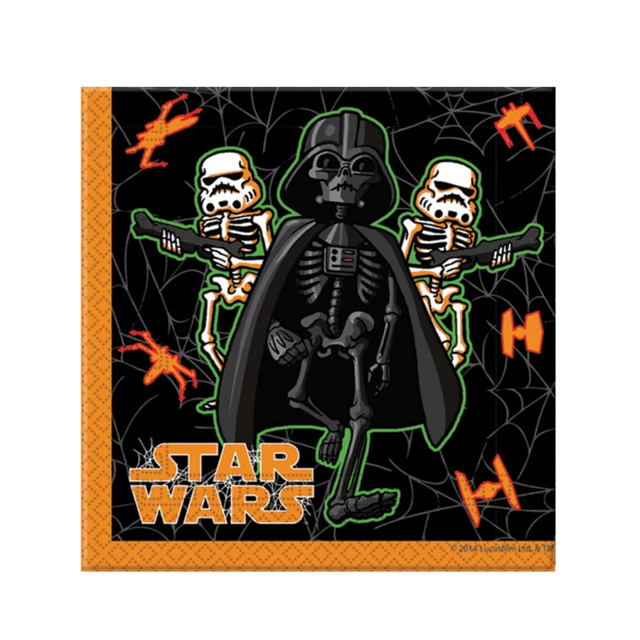 20 serviettes carrées de 33 cm de côté une fois dépliées. Elles possèdent un liséré orange et au centre on peut voir Dark Vador sous forme de squelette accompagné de maître Yoda dans un décor lugubre.