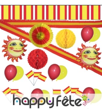 L'Espagne, belle destination de vacances, beau pays ensoleillé, habitants accueillants et souriants. Tout cela donne forcément envie d'y être, mais si l'on ne peut pas s'y déplacer, pourquoi ne pas mener l'Espagne à soi. Une petite fête à l'espagnole, ça vous dirait ? Pas toujours besoin d'attendre la fête nationale, toutes les occasions sont bonnes pour arborer ces belles couleurs vives jaune et rouge du drapeau espagnol avec les décorations Espagnoles. Alors, des drapeaux, nous en avons de multiples modèles et de toutes les tailles que vous pourrez utiliser à souhait ! Nous avons également de magnifiques guirlandes ou une boule alvéolée pour offrir du soleil à votre fête, et même des castagnettes pour assurer la musique. Pour les plus pressés, vous pouvez vous emparer tout de suite du kit complet de décoration Espagne qui contient des drapeaux, des ballons rouge et jaune, des guirlandes, un lampion soleil et des boules en papier alvéolé, vous aurez juste à les sortir de leur emballage et à les disposer en quelques minutes. Quoiqu'il en soit, une fête sur l'Espagne, dans tous les cas, ça va chauffer, à ne surtout pas rater !
