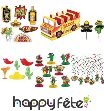 S'il y a bien des pays réputés pour le farniente, le Mexique en fait partie. Alors, si l'on parle d'une fiesta mexicaine, pour la fête nationale, un carnaval ou un anniversaire, les invités se délecteront d'avance d'une ambiance assurée. Commencez par planter le décor mexicain en utilisant nos décors de sable du désert, le set de décors du désert, le kit de décoration tex mex, ou les décorations fiesta mexicaine. Des petits drapeaux mexicains par ci par là s'imposent bien sûr, des suspensions de motifs fiesta mexicaine avec des petit sombreros, piments, cactus etc. Nous avons tout aussi bien des petits cactus gonflables, pour rappeler le désert encore, et du piment en papier alvéolé ou des guirlandes de piments pour se référer au goût relevé des plats typiques du Mexique. En parlant de plats, en servant les vôtres, vous pourrez aussi utiliser les sticks cocktail fiesta, très originaux pour piquer vos cocktails. Et finalement, pour le plus grand plaisir des enfants, nous vous suggérons de faire l'acquisition d'une pinata multicolore, licorne ou Mexican star. Faites le plein d'idées et à vos paniers !