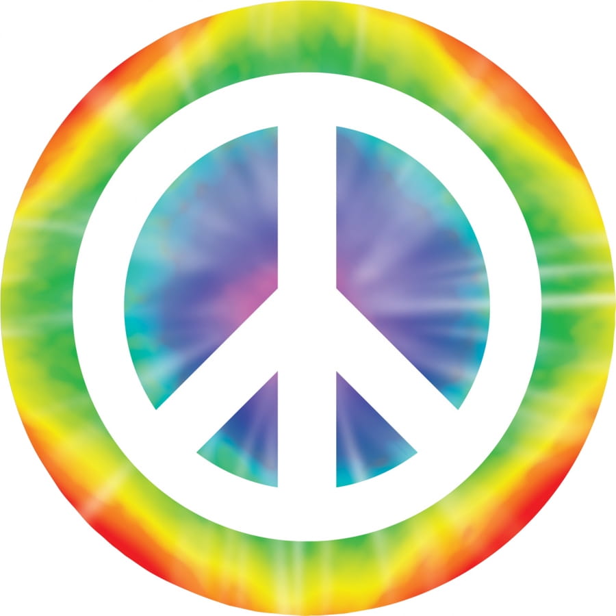 Décoration en carton en forme de signe "Peace and Love" multicolore. Les deux surfaces du carton sont imprimées et mesurent 35 centimètres. Accrochez ce carton bien en vue pour mettre vos invités dans l'ambiance des années 50-60!