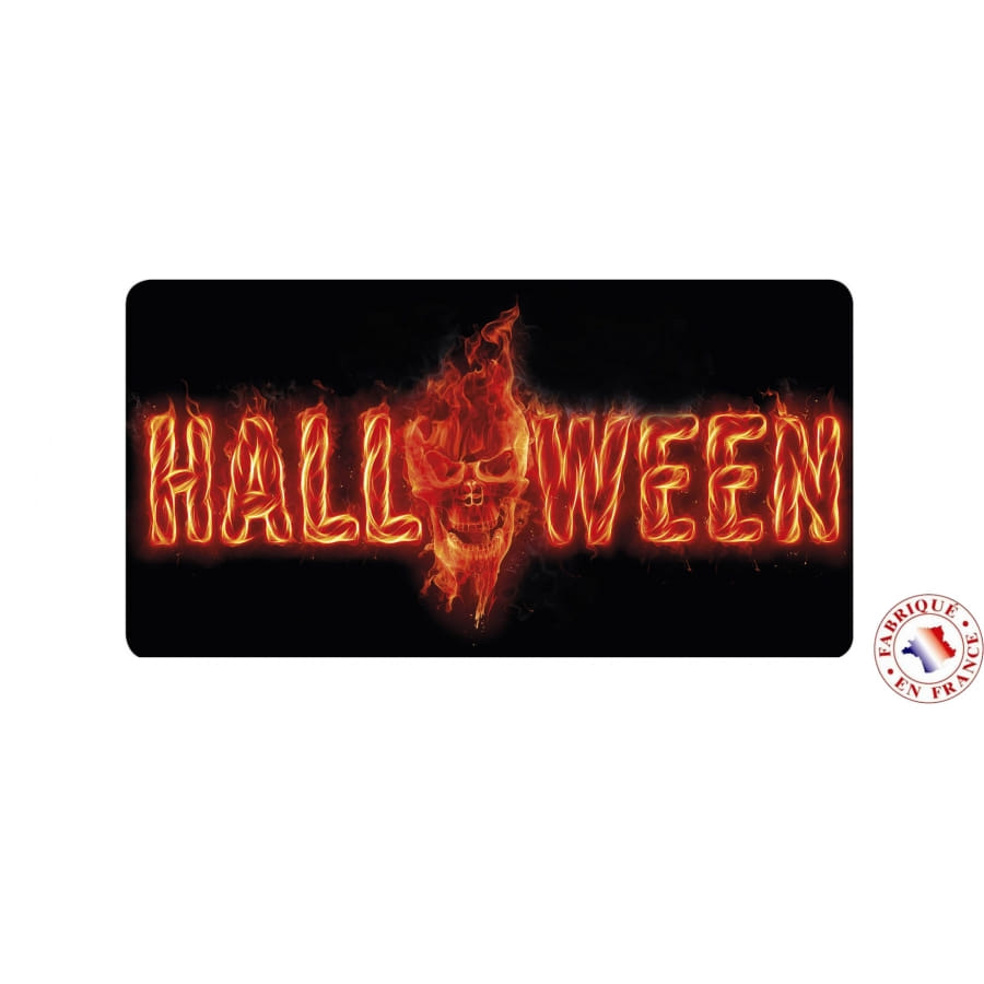 Elle représente le terme "Halloween" en lettres de feu imprimée sur un fond noir.