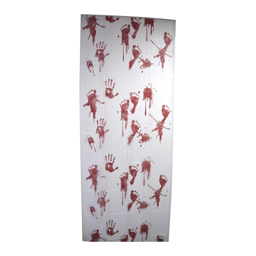 On retrouve toujours du sang sur une scène de crime. Cette fois-ci, vous en découvrirez partout sur ce décor mural en tissu. Il présente des imprimés en forme de traces de mains et de pieds ensanglantés de couleur rouge, sur un support blanc. Il fera son effet sur une porte ou accroché à un mur, à l'occasion d'Halloween ou d'une fête à thème série policière. Vous disposerez en tout d'un décor de 3 m de long sur 75 cm de large.