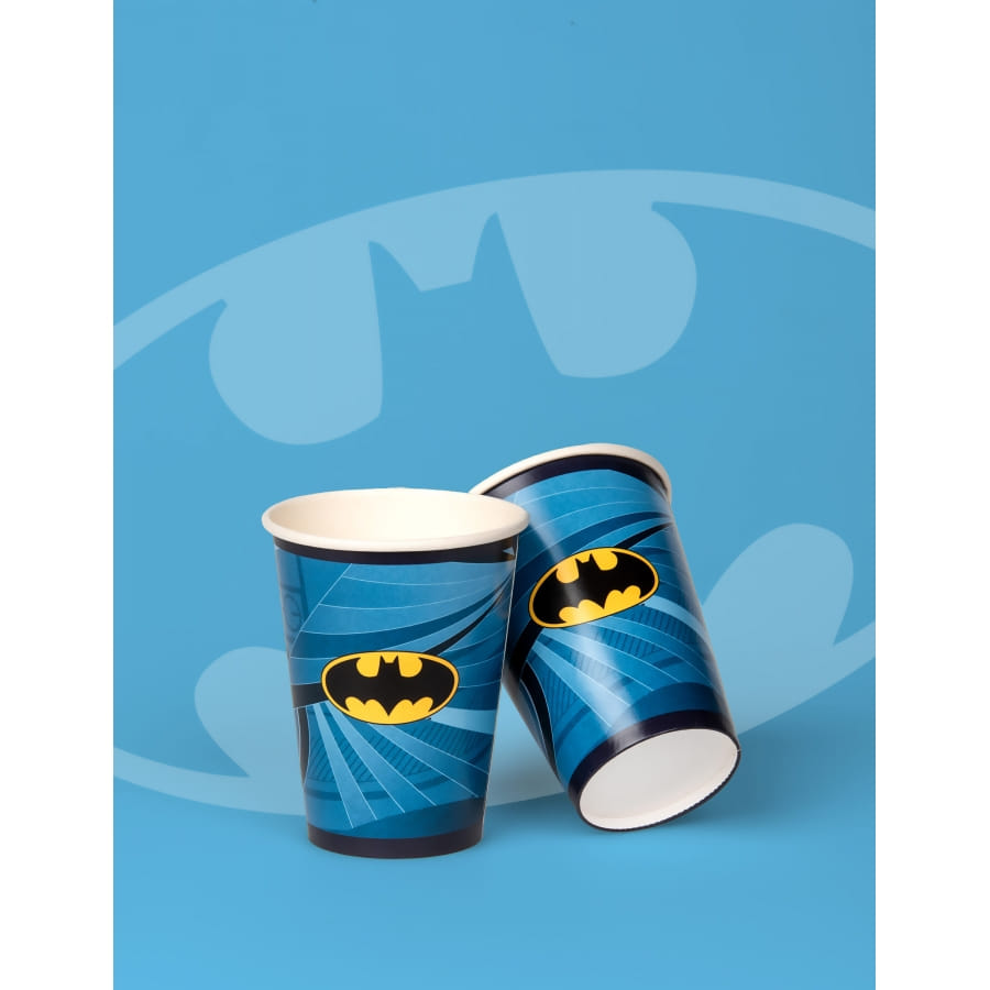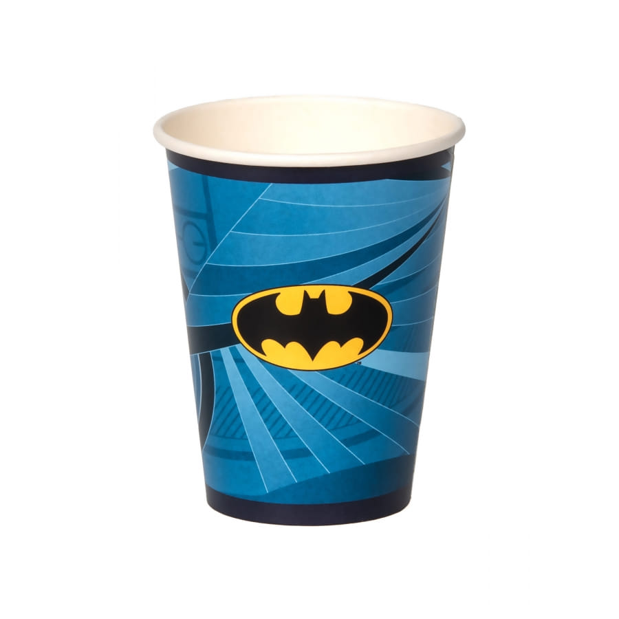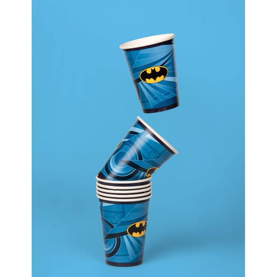 Mais attendez, ce n'est pas tout ! Si vous allez avoir des assiettes aussi cool, pourquoi ne pas assortir vos gobelets ? Voici donc huit gobelets en carton, également sous licence officielle Batman™. Leur contenance est d'environ 210 ml, idéale pour servir des boissons dignes d'un super-héros. Avec un fond bleu, des illustrations de Gotham et le fameux logo de Batman au centre, ces gobelets compléteront parfaitement votre table.