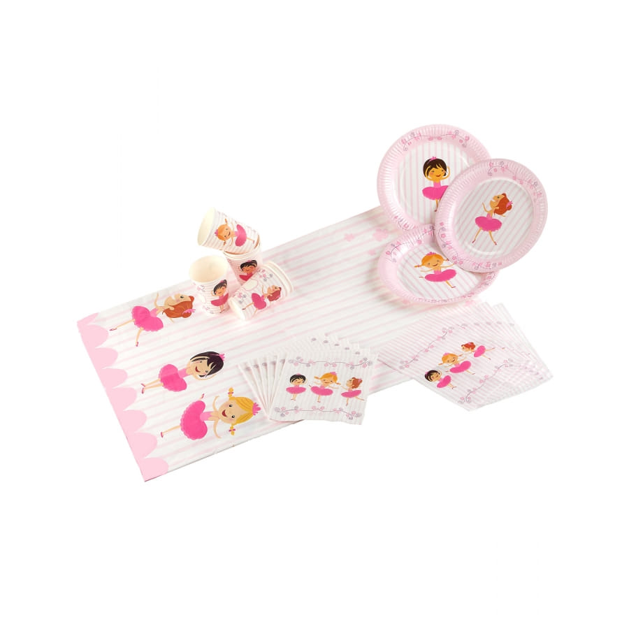 Le kit d'anniversaire comprend 6 sacs cadeaux de 1 x 23 cm fabriqués en plastique 6 gobelets cartonnés de 25 cl, 6 assiettes cartonnées de 23 cm, 6 serviettes en papier de 33 x 33 cm (une fois ouvertes), et 1 nappe en plastique mesurant 130 x 180 cm.