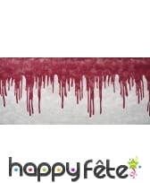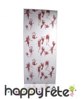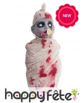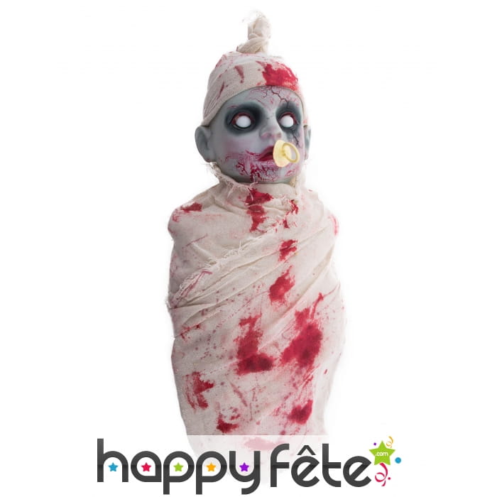 Il a une sucette dans la bouche et est enveloppé dans un drap portant des tâches de sang.