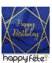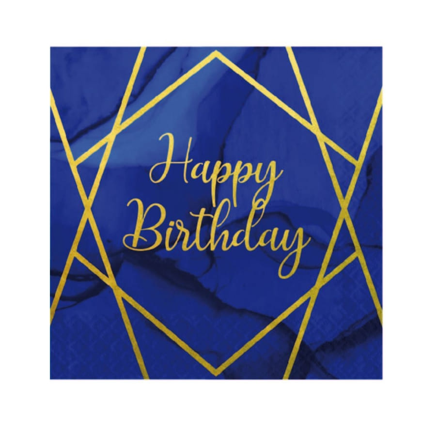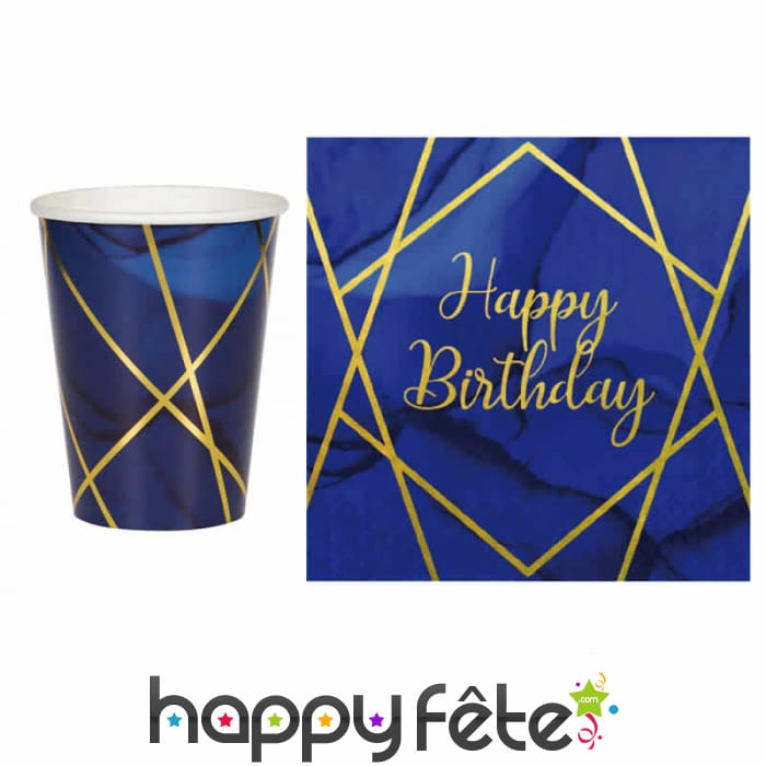 Chacune d'elles possède un fond en nuance de bleu sur lequel sont imprimées des motifs géométriques dorés entourant l'inscription "Happy Birthday" de la même couleur.