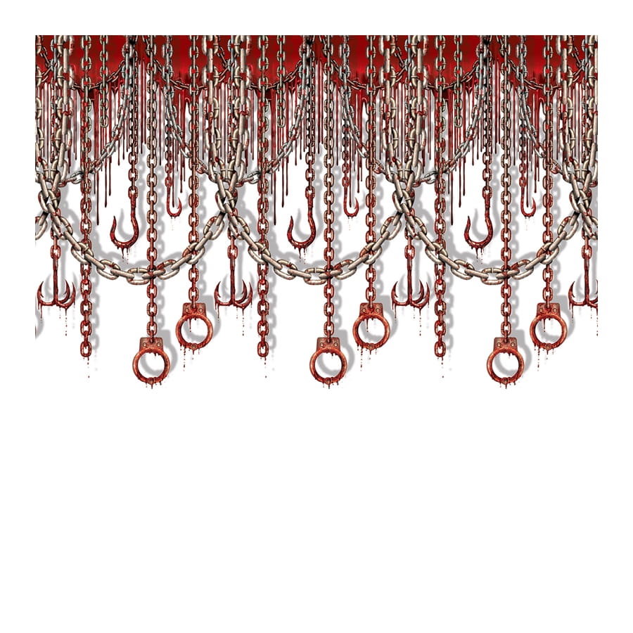 Les fêtes les plus réussies sont celles qui sont les mieux décorées. Il est donc question de réunir tous les accessoires nécessaires. Pour donner la chair de poule à vos invités, misez sur la décoration murale sans relief, destiné à orner vos murs. Elle arbore plusieurs chaînes et crochets ensanglantés qui se mêlent au décor. Ce large affiche mesure 1,2 sur 9,1m pour décorer intégralement votre intérieur.