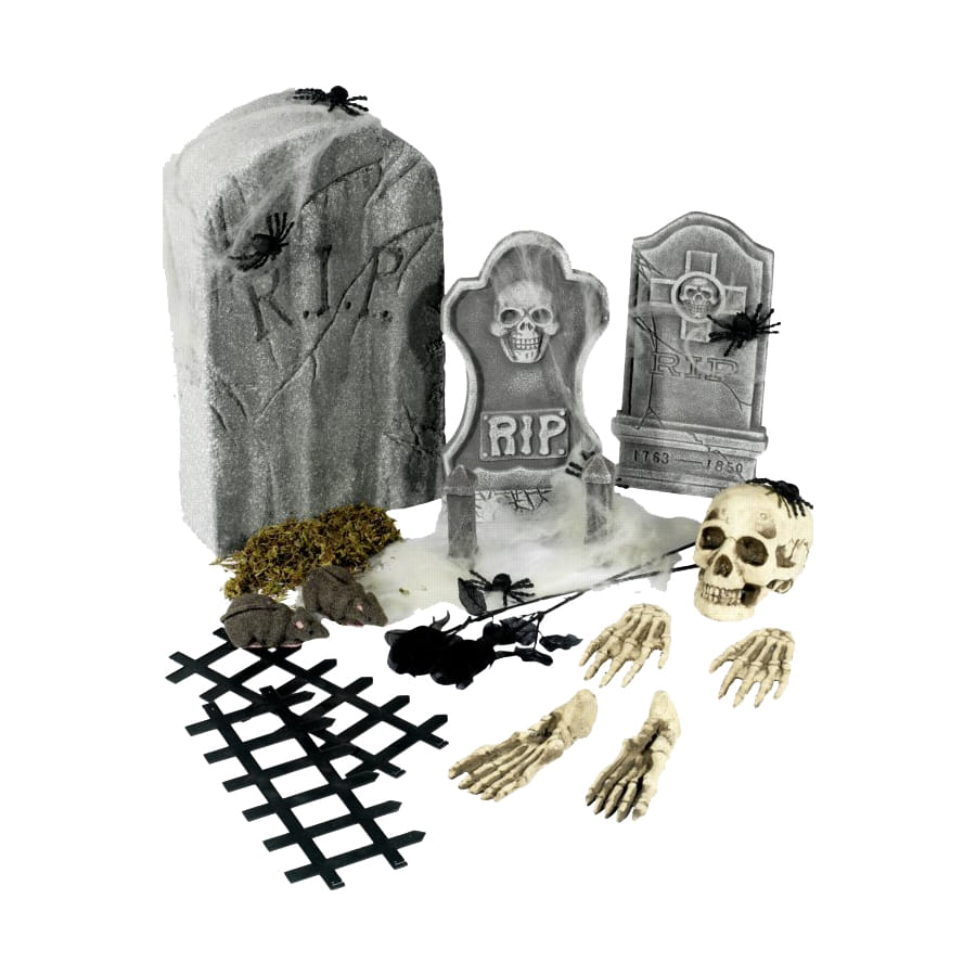 Lot de 24 décorations basées sur le thème du cimetière. Ce set incluent des pierres tombales, des mains et pieds de squelette, un crâne, des rails, des feuilles mortes, des roses noires et des rats. Installez-les dans votre jardin ou maison pour créér une ambiance sombre pour Halloween.