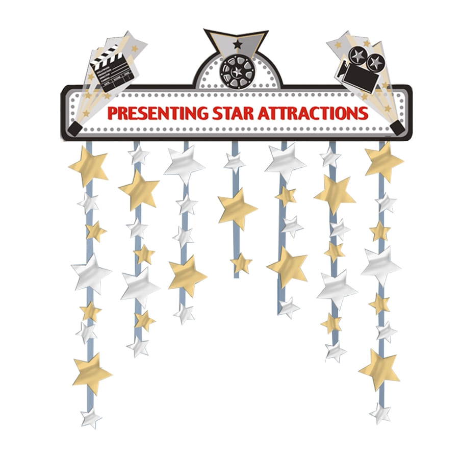 Soignez votre entrée en matière de décoration. Votre fête aura une grande envergure avec cette décoration de porte pour entrée cinéma, exactement comme lors d'une avant-première ! Ce modèle mesurant 1,65 m x 85 cm est à positionner à l'entrée de votre fête. Il vous offre des motifs cinéma de couleur argent et or et bronze.