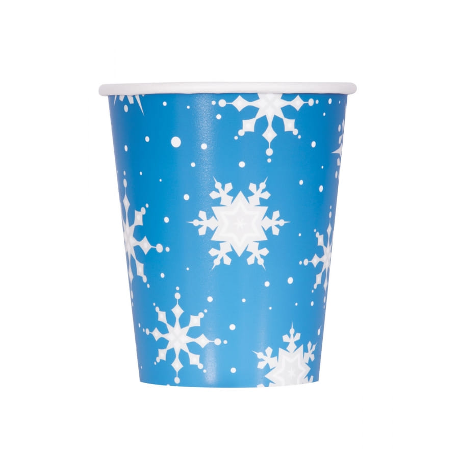 - 1 lot de 8 gobelets en carton bleu floqué de plusieurs flocons de neige. Ils ont une contenance de 270 ml.
