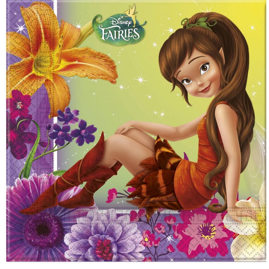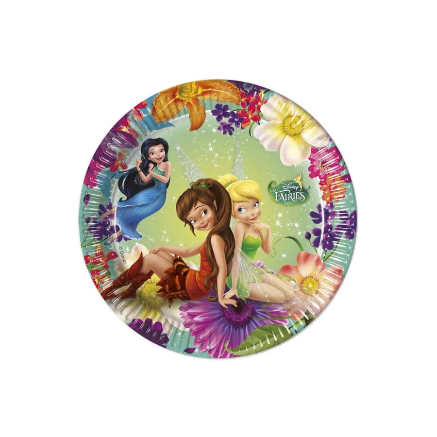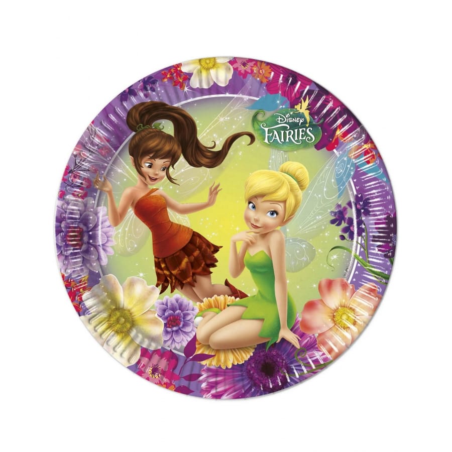 8 assiettes cartonnées de 23cm de diamètre avec des fleurs multicolores et les personnages Fée Clochette et son amie Noa.
