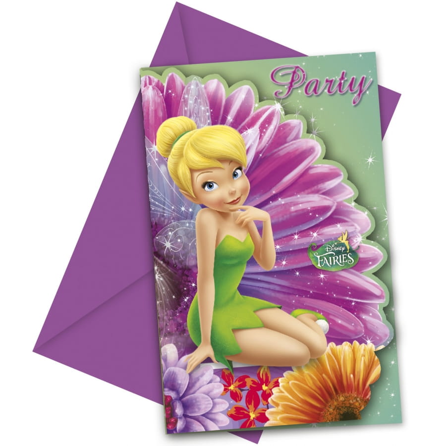 6 cartons d'invitation de 9x14cm pliés avec la première page en forme de fleur et la dernière page avec Fée Clochette assise dans les fleurs multicolores.